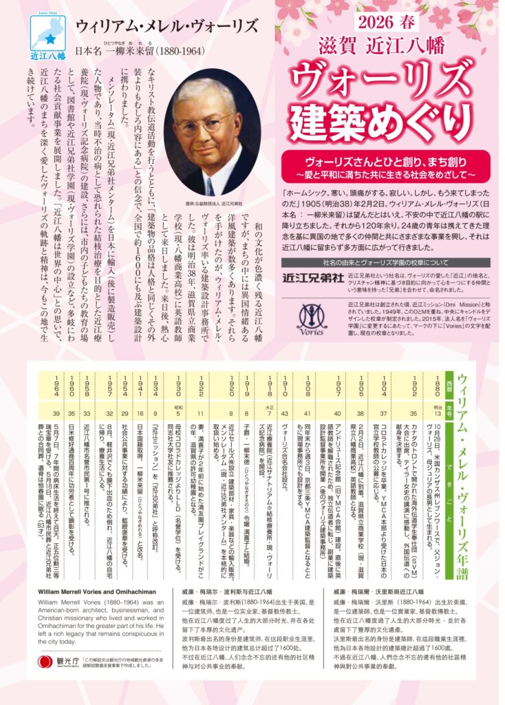 2.ボランティアガイドによる「ツッカーハウス・礼拝堂・五葉館」ガイド(予約不要)2025年はヴォーリズが来日して120年を迎える記念の年です。ヴォーリズ来日120年記念して、「ヴォーリズ建築めぐり」などが行われます。 1.観光ボランティアガイドツアー 期 間:2025年11月29日(土)~12月6日(土) 但し12月1日(月)は除く(ハ... -